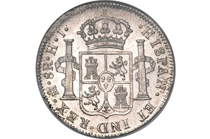 Mais que sont ces deux barres ? Ce ne sont pas des barres, mais deux colonnes, symboles de l’ancienne monarchie espagnole. Elles ornaient la fameuse pièce de 8 réals, le « dollar espagnol » qui circulait jadis dans tout le Nouveau Monde.