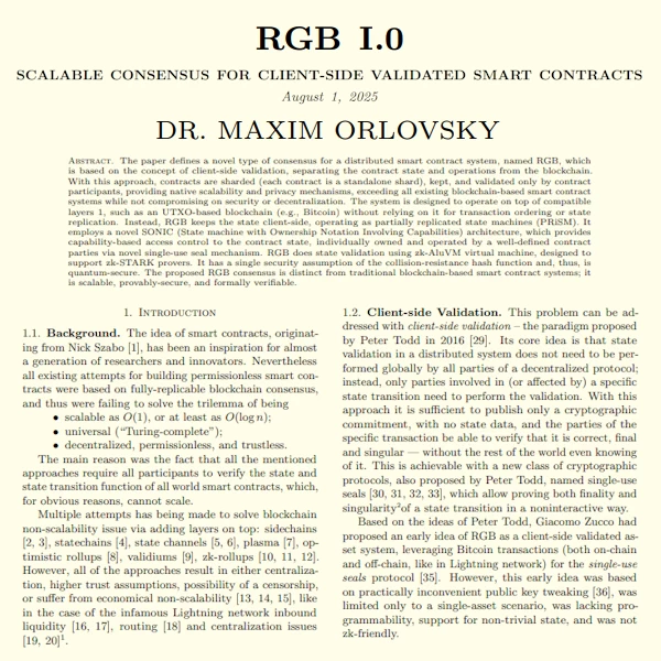 « Ce document définit un nouveau type de consensus pour un système de contrats intelligents distribués, nommé RGB, basé sur le concept de validation côté client, séparant l’état et les opérations des contrats de la blockchain. Avec cette approche, les contrats sont partitionnés (chaque contrat constitue un fragment indépendant), stockés et validés uniquement par les participants au contrat, offrant des mécanismes natifs de scalabilité et de confidentialité, surpassant tous les systèmes de contrats intelligents basés sur la blockchain existants sans compromettre la sécurité ou la décentralisation.