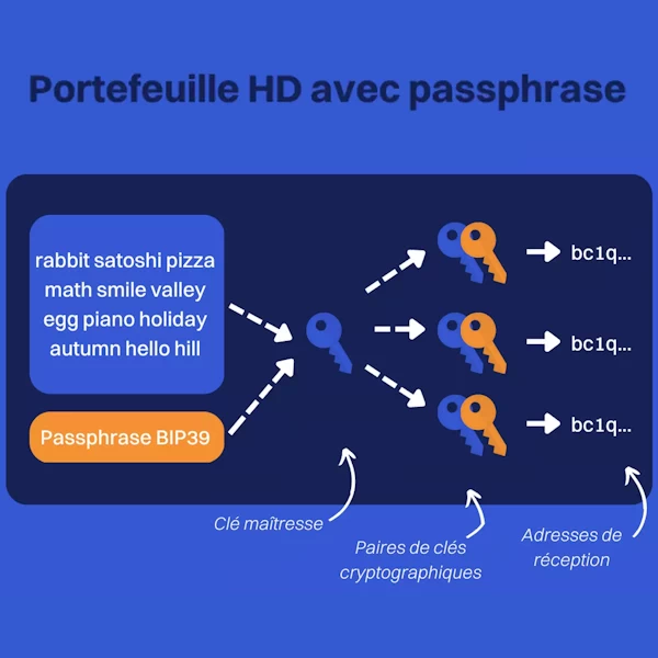 « La passphrase et la phrase de récupération (24 mots) sont utilisées ensemble pour déterminer la graine du portefeuille HD, la clé maîtresse, et donc toutes les clés cryptographiques qui en découlent.