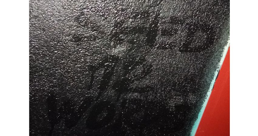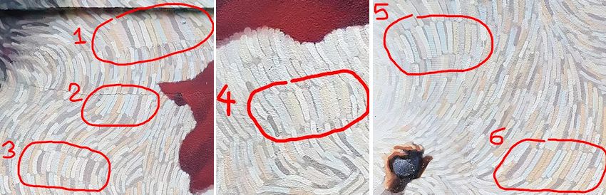 Je suis retourné à la fresque le 9 janvier au soir avec une torche led bleue, pensant que d’autres inscriptions était cachées de la même manière. Je n’ai rien trouvé de tel. Mais des sortes de blocs, code-barres, traits alignés ont attiré mon attention dans le fond de l’œuvre. J’ai pris pleins de photos pour analyser au chaud et sur PC.