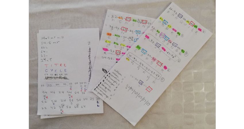 Au fur et à mesure, on a fait une liste raccourcie de 50 mots de six lettres ou plus, soit en rapport avec le sujet de la fresque, soit qui collaient avec des positions de lettre dont était plus sûrs que d’autres, et aussi une liste de combinaisons possibles de l’ordre des mots. L’ordre n’était pas totalement aléatoire, avec les groupes trouvés, deux par deux, par bloc par zone, on a sélectionné dix ordres possibles. Cela fait au total 500 000 combinaisons possibles. Une question d’heures si nos hypothèses étaient les bonnes.