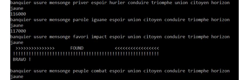 Le résultat est le mnémonique de douze mots, valide en checksum : « banquier usure mensonge peuple combat espoir union citoyen conduire triomphe horizon jaune », avec un chemin de dérivation BIP32 totalement standard avec BIP44 = m/44’/0’/0’/0/0.