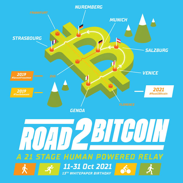 Lancé par Vitus Zeller, organisateur de nombreux événements sportifs autour de Bitcoin, Road2Bitcoin est un relais « à propulsion humaine » (marche, course, vélo…) qui partira du port Gênes le 11 octobre 2021 pour arriver devant le Parlement européen à Strasbourg le 31 octobre.
