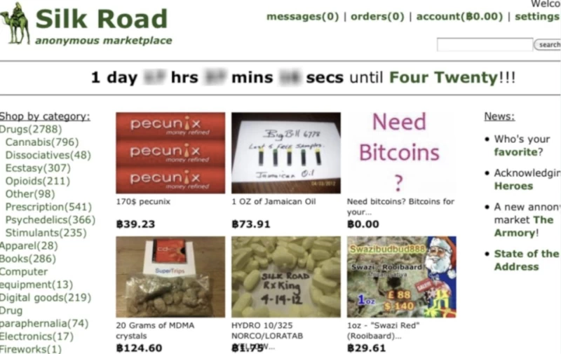 Le site Silk Road a fonctionné au moins entre janvier 2011 et octobre 2013, date de l’arrestation de Ross Ulbricht à San Francisco. Utilisant le réseau Tor, il permettait aux internautes d’acquérir anonymement des produits illicites contre des bitcoins.