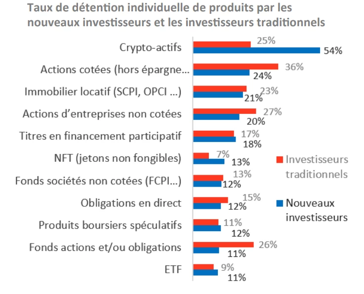 Les nouveaux investisseurs investissent moins fréquemment en bourse que les investisseurs traditionnels : ils sont 61 % à dire détenir des placements en bourse (actions, fonds, ETF, etc.), contre 84 %. 24 % disent détenir des actions cotées (36 %) et 18 % des titres de financement participatif (17 %). Beaucoup se sont intéressés aux crypto-actifs : 54 % d’entre eux en possèdent (63 % parmi les nouveaux investisseurs âgés de 25 à 34 ans), contre 25 % des investisseurs traditionnels. »