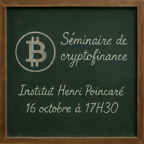 Le prochain séminaire de cryptofinance organisé par Martino Grasselli, Ricardo Pérez-Marco et Cyril Grunspan aura lieu jeudi 16 octobre à 17H30 à l’Institut Henri Poincaré à Paris.
