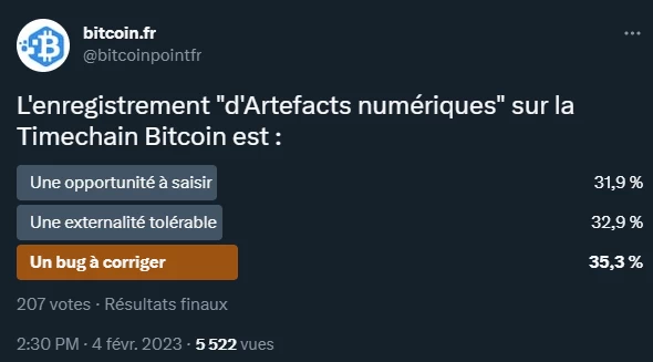Pour d’autres, ces « artefacts » ne sont que des déchets indésirables qui alourdissent inutilement le registre avec le risque de décourager de nouveaux opérateurs de noeuds et de nuire à la décentralisation du réseau. L’objectif de SegWit et de Taproot n’ayant jamais été de stocker de vulgaires NFT dans l’espace de bloc, il s’agit donc d’un bug qu’il faut corriger.