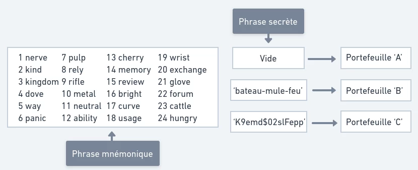 Une phrase secrète (passphrase) est un formidable élément à ajouter à une configuration de portefeuille afin d’ajouter une couche de sécurité pour protéger ses bitcoins. La phrase secrète agit en quelque sorte comme un 25e mot à la phrase mnémonique. Une fois que l’on en ajoute une, un portefeuille entièrement nouveau est créé ainsi qu’une clé privée et sa phrase mnémonique y étant associé. Il n’est pas nécessaire de prendre en note la nouvelle phrase mnémonique, car ce portefeuille est atteignable en combinant la phrase mnémonique initiale avec la phrase secrète choisie.