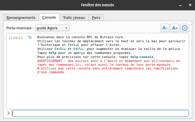 Une fois le portefeuille créé dans Bitcoin Core, allez dans l’onglet Fenêtre > Console et assurez-vous que le portefeuille sélectionné au haut de la page affiche bien le nom de celui que vous avez créé.
