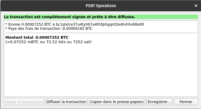 De retour sur Bitcoin Core, allez dans l’onglet Fichier > Charger la TBSP d'un fichier, et saisissez le fichier de transaction signé .psbt. L’encadré PSBT Operations s’affichera à l’écran, confirmant que la transaction est complètement signée et prête à être diffusée. Ne reste plus qu’à appuyer sur Diffuser la transaction.
