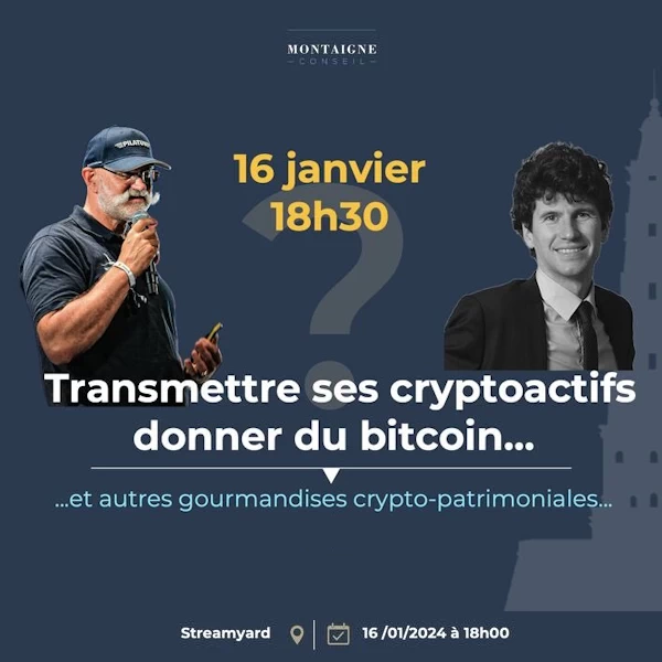 « Venez nous rejoindre pour un webinaire exceptionnel afin de tout comprendre sur la transmission de Bitcoin (et du reste) en compagnie d’Henri Leyrat, notaire et Docteur en Droit. »