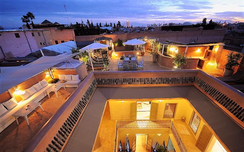 « Le riad principal dispose d’une piscine, d’un hammam en marbre et tadelakt rouge oriental, une salle de massage, salle à manger, salon, bar dans le riad avec alcool au rez de chaussée. A l’étage en passant au dessus du derb (la ruelle), on découvre la fontaine murale dans le second riad avec ses bananiers. Sur le toit, vous profiterez d’une grande terrasse aménagée avec un espace pour diner, un barbecue et des salons privés et une vue sur toute la medina, la Koutoubia et les sommets enneigés de l’Atlas. »